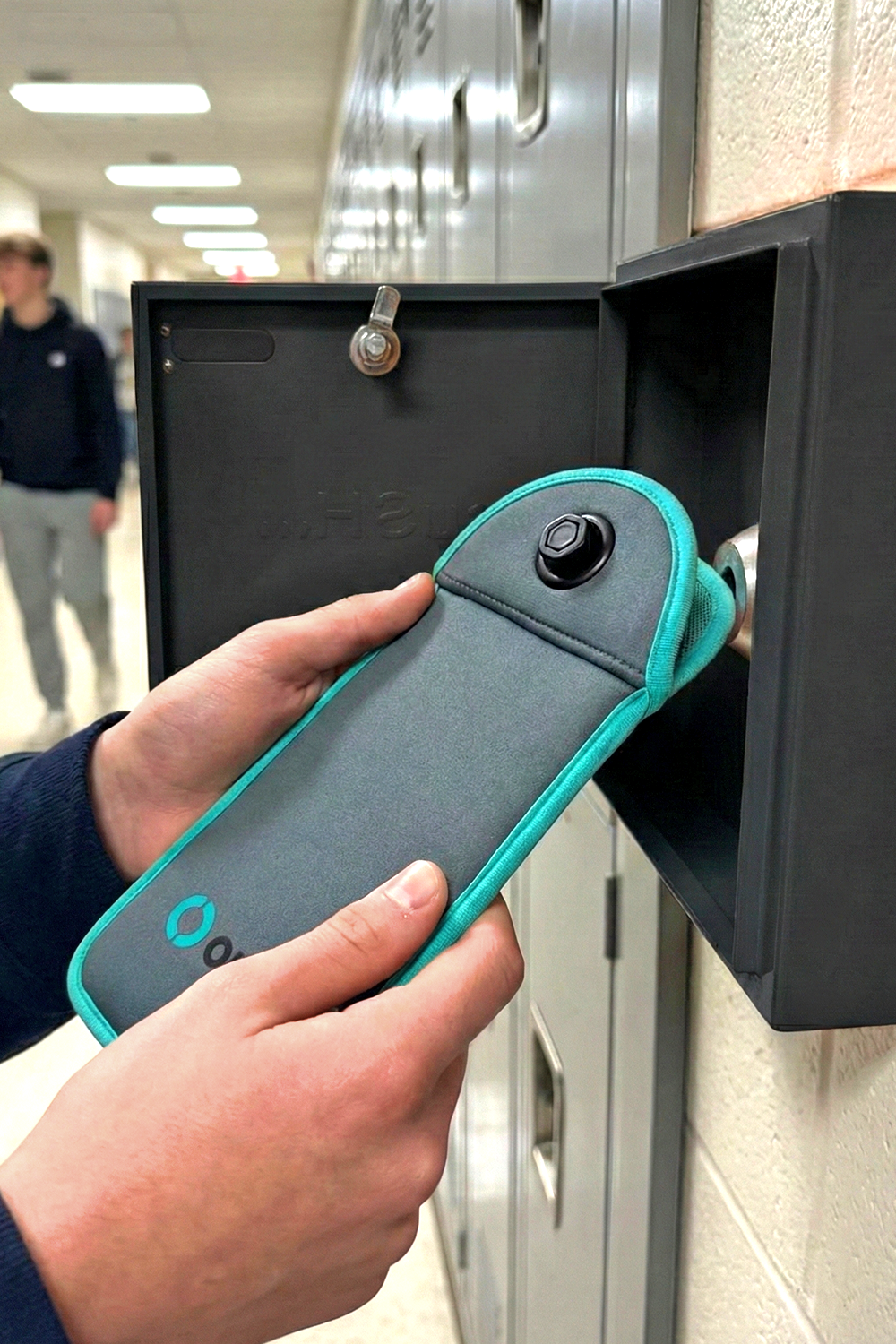 Phone pouches are issued to students, who lock their phone inside the pouch upon arriving at school with a clever magnetic closure system.